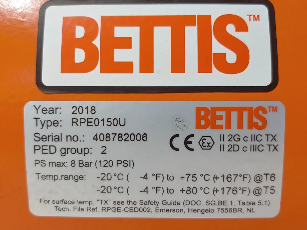 Bettis RPE0150U Actuator w/ Westlock Positioner 9479NBY2B2M0600 Bettis Type RPE0150U PED Group 2 PS Max: 8 Bar ( 120 PSI ) Westlock Position Monitor: 9479NBY2B2M0600 SPDT 3 AMP - 120VAC, 2 AMP - 24VDC Temp OP Range: -40° To 60°C Asco 1/4" Pipe Valve: EF8320G184 / Solenoid: EF8003G1 AIR-INERT-GAS: 150 PSI / Water: 150 PSI / LT- Oil: 150 PSI Side Threaded Entry: 1/4" NPT Bettis Actuator w/ Westlock Positioner & ASCO Solenoid Valve